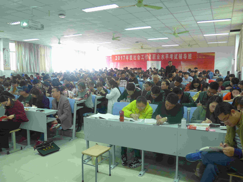 此次培训分为初级班和中级班两个班次,邀请了山东省管理学院、济南大学、山东建筑大学等高校的多位老师进行授课;并为初、中级考试的学员免费提供了《社会工作实务》《社会工作综合能力》《社会工作政策与法规》《全国社会工作师职业水平考试大纲》等教材。活动受到青年的热烈欢迎,现场十分火爆,同学们早早到教室占座,教室座无虚席,更有同学们搬着板凳坐在走廊和教室前后排认真听课,人员虽然多,但是准社工们发扬“利他主义”的社会工作者精神,相互帮助。
