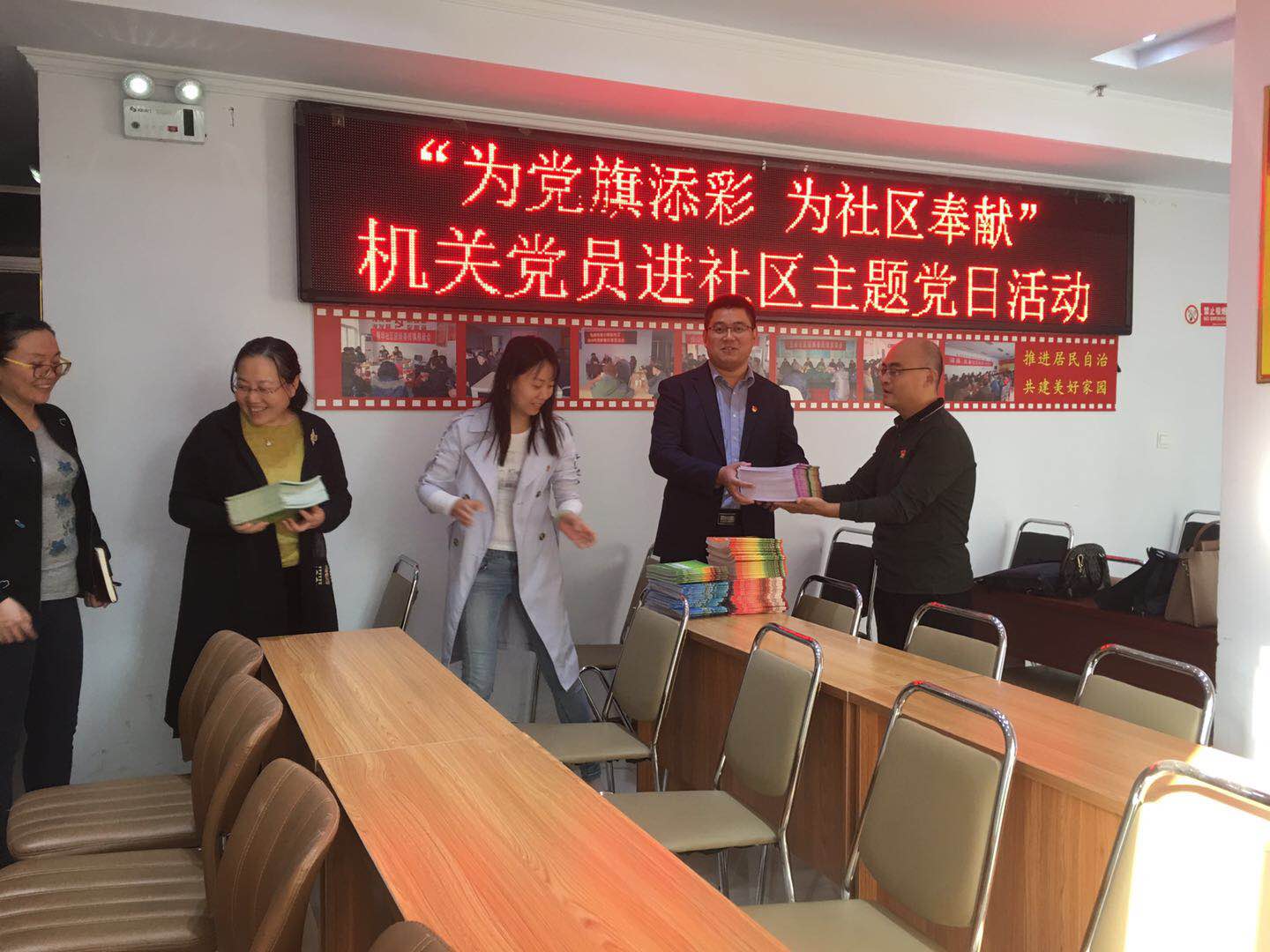 支部全体党员干部集体向社区报到登记,为社区少年儿童捐赠了100本中小学生自护教育、节能减排、食品安全手册,看望慰问了社区孤寡老人和困难家庭,为他们带来了米、面等生活物品。通过深入走访交流,认真听取了社区居民对党建工作的意见建议,为下一步开展志愿服务、参加公益活动、参与社区建设明确了方向。