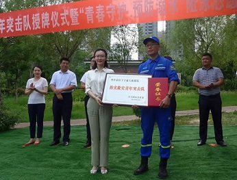 李梦遥为枣庄市红十字蓝天救援队颁发奖牌和证书。
