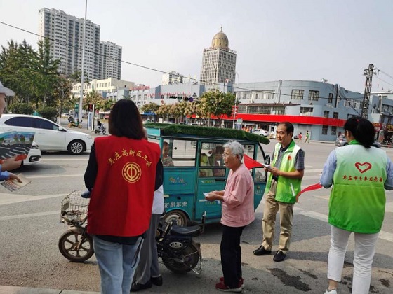 志愿者们与高新区交警在泰山路与神工路路口,现场向行人发放“文明交通 平安出行”倡议书,《自救互救手册》、等宣传材料,向广大市民宣传安全自护、遵守交通规则等守法意识和文明意识。