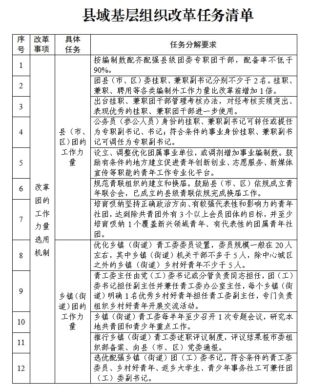 高标安排。县域共青团基层组织改革以来,团市委多次向市委汇报改革试点和全市层面推进情况。市委书记陈平在枣庄市学习贯彻庆祝中国共产主义青年团成立100周年大会精神座谈会和市委党的群团工作座谈会上对县域共青团基层组织改革提出明确要求。制定《关于进一步加强党建带团建工作的任务清单》,将8个方面措施逐项分解为30项具体任务,逐项确定牵头单位和责任单位,统筹各项任务落实见效,推动形成党建带团建工作合力。团市委书记分别到五个区进行专项调研督导,与区(市)党委主要领导沟通县域共青团改革事宜,为区(市)推进改革扫清障碍、优化环境。