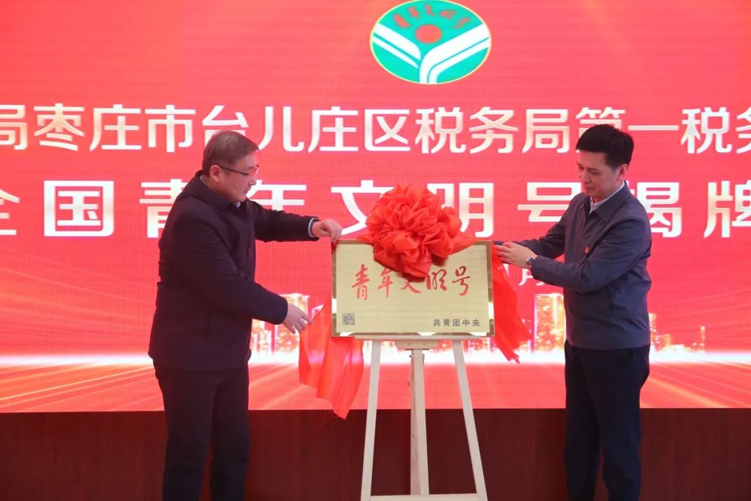 最后,团市委及市税务局相关同志共同为枣庄市台儿庄区税务局第一税务分局(办税服务厅)全国青年文明号揭牌。