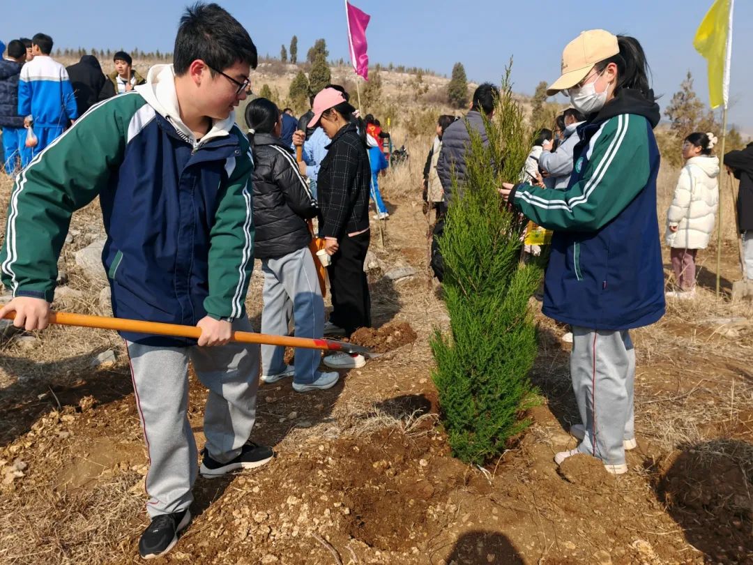 植树现场,全体参与人员热情洋溢,或两人一组,或三五成群,在工作人员的指导和协助下,分工协作、密切配合,有的扶苗填坑,有的挥锹培土,有的浇水灌溉,每一道工序都细致认真,经过2个多小时的辛勤劳作,一个个树苗错落有致、迎风挺立,在明媚的阳光中散发着勃勃生机。