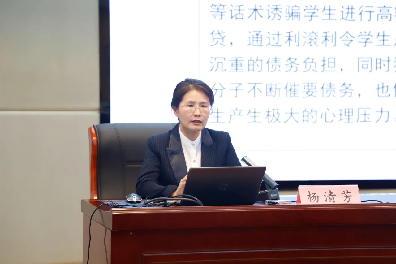 杨清芳律师以《警惕网络诈骗,远离帮助信息网络诈骗犯罪》为主题,首先针对学生社会阅历不足、法治观念不深的特点,通过介绍常见的网络诈骗类型和典型电信网络诈骗案例,为同学们生动地传授了如何防范网络诈骗的技巧。随后,又向同学们详细讲解了帮助信息网络犯罪活动罪(以下简称帮信罪),利用通俗易懂的语言分析了帮信罪案例,提高了同学们对帮信罪的认知和防范意识。