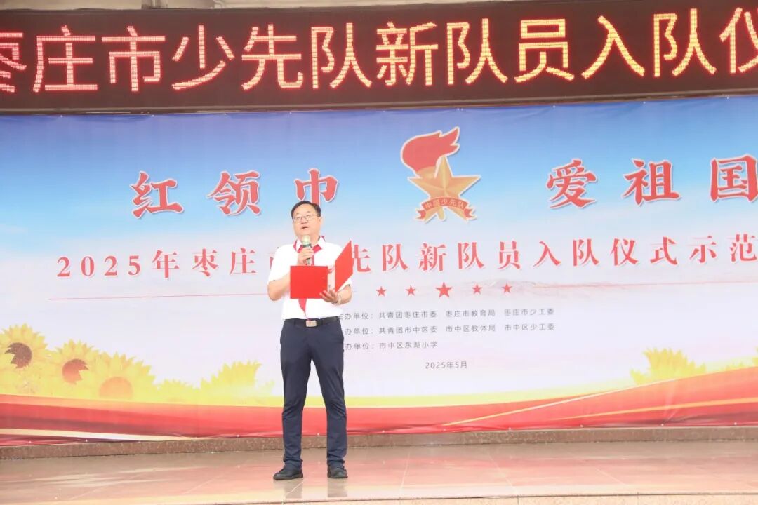 为深入学习贯彻落实习近平总书记关于少年儿童和少先队工作的重要论述,进一步加强少先队组织建设,增强少先队员光荣感和组织归属感,深刻感受到红领巾背后的责任与使命,团市委、市教育局、市少工委主办,市中团区委、区教体局、区少工委承办的枣庄市少先队新队员入队仪式示范活动于5月23日在市中区东湖小学成功举办。