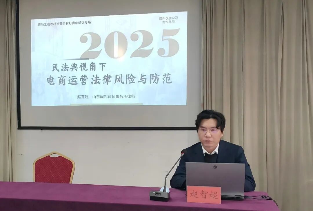 山东闻邦律师事务所专职律师赵智超围绕《民法典》下的电商运营法律风险与防范,结合大量案例进行专题解读,深入浅出、内容充实,为广大青年发展乡村产业提供了宝贵的法律指导,有效提升了学员的风险防范意识。