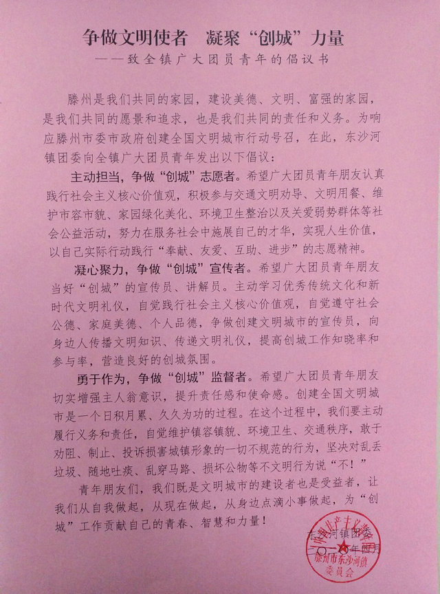 近日,东沙河镇团委持续发力,组织团员青年网上发布《争做文明使者 凝聚“创城”力量 ——致全镇广大团员青年的倡议书》,动员全镇广大团员青年从自我做起,从现在做起,从身边点滴小事做起,为“创城”工作贡献自己的青春、智慧和力量!