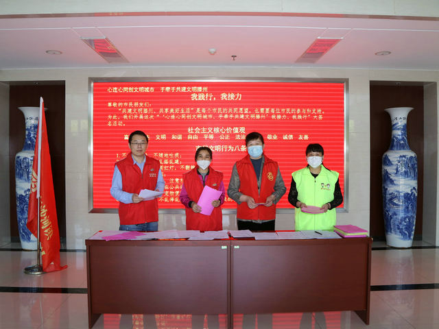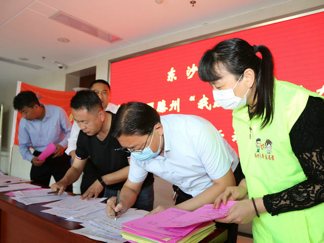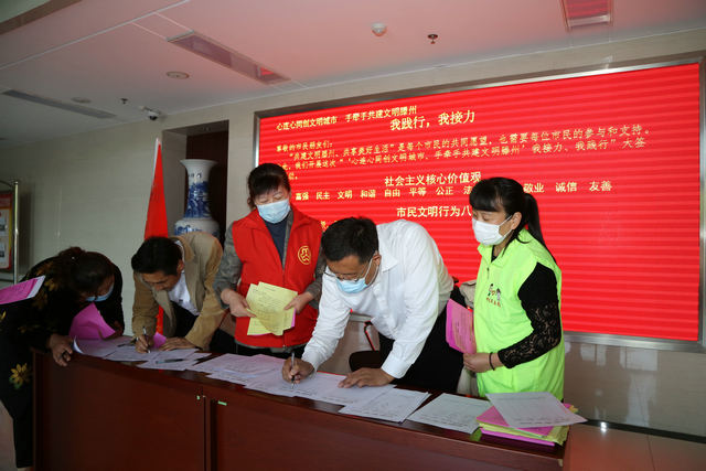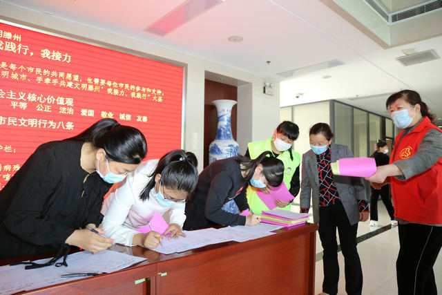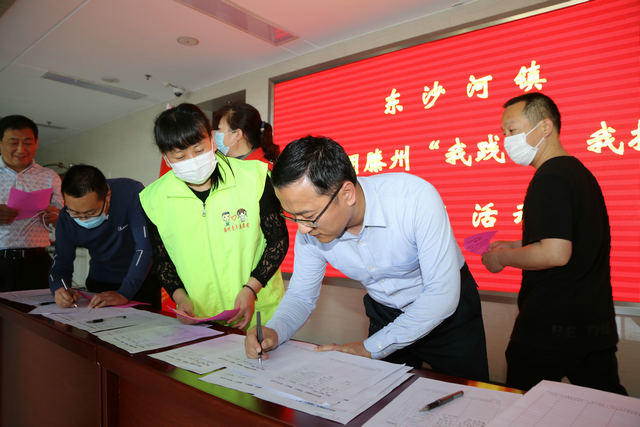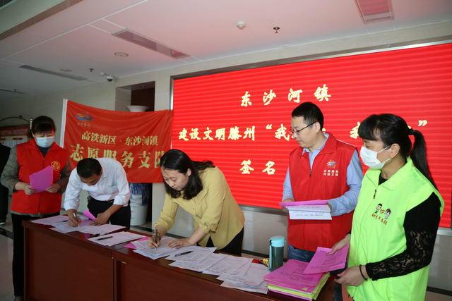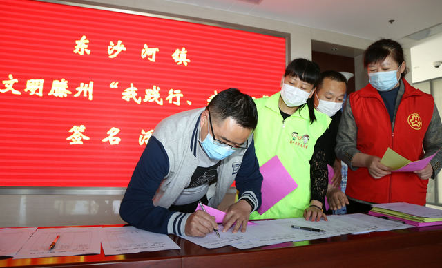 同住一座城,共爱一个家。为积极响应全国文明城市创建工作,5月6日,东沙河镇团委联?合镇宣传信息岗、精神文明岗、妇联在镇政府门厅开展建设文明滕州“我践行、我接力”签名活动,镇领导干部、机关干部、镇直部门人员积极踊跃参与活动,在签名表上纷纷签名承诺以示“创城”决心。