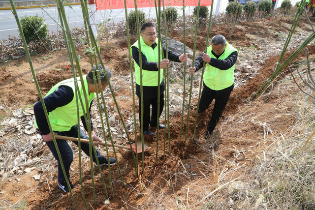 在植树活动现场,大家手握铁铲,扶苗、培土……积极投入到植树劳动中。经过一番热火朝天的劳动,当日共种植了钢竹3000多棵,黄连翘1000多棵,一排排新栽树苗在春日里迎风挺立,呈现出一派绿意盎然、生机勃勃的景象。