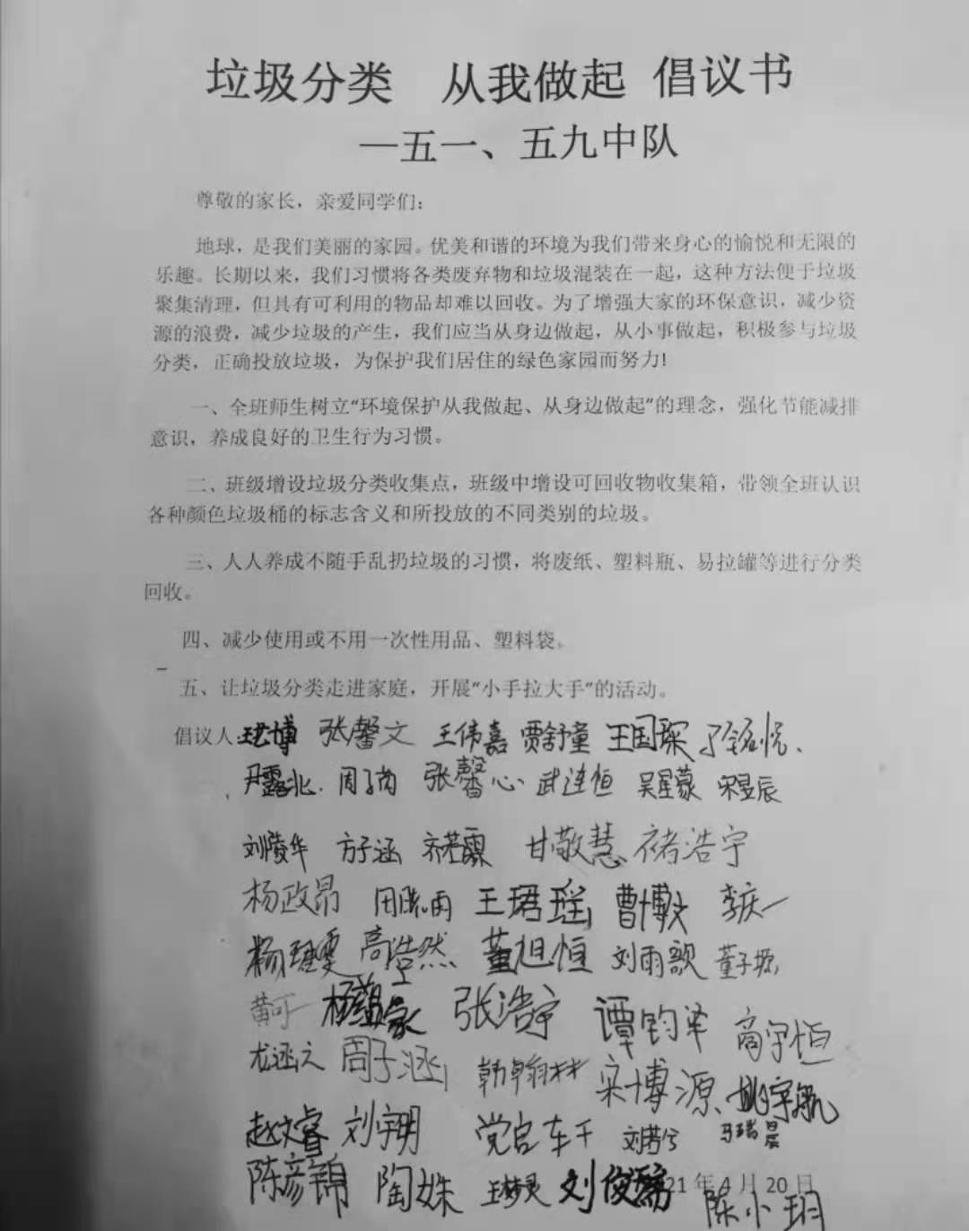 队员们,郑重在倡议书上签下了自己的名字,积极参与垃圾分类,正确投放垃圾,为保护我们居住的绿色家园而努力!