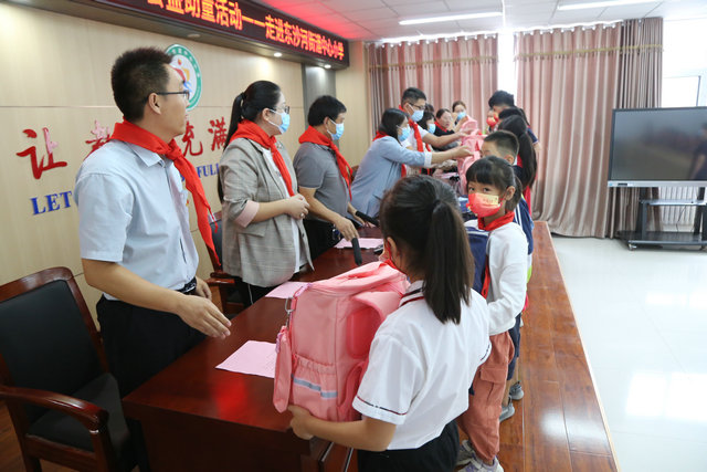 为孩子们现场发放书包、铅笔、学习本、儿童口罩等用品。