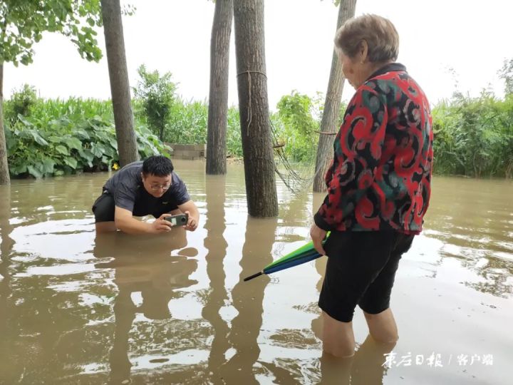 一线身影·2021年7月29日,台儿庄强降雨,枣庄日报全媒体记者涉水到泥沟镇采访。