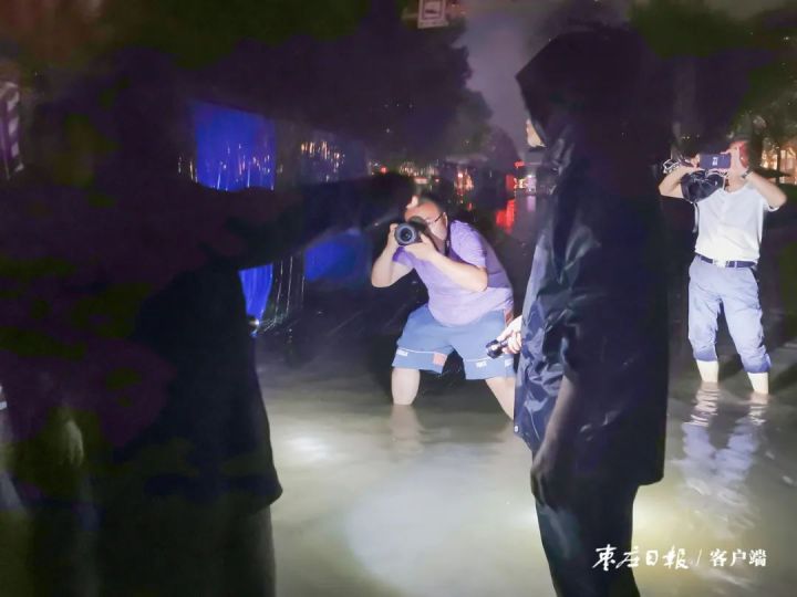 直击现场·2021年7月28日,受台风“烟花”影响,我市普降大雨,部分路段积水严重,7月29日凌晨两点半,枣庄日报全媒体记者在高新区兴仁街道采访城区排内涝情况。