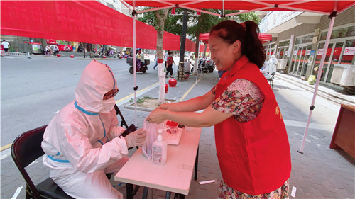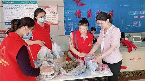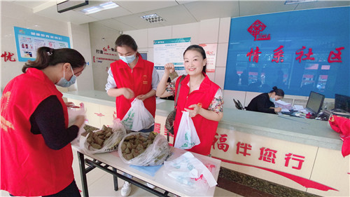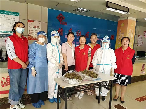青年志愿者付文莹带头包粽子,卷粽叶、填米馅料、封口、扎线,虽然手法还不是很娴熟,但她做得却格外认真。付文莹和志愿者们来到马号街社区核酸检测点,为奋战在一线的医护人员和社区工作者送上了浓浓的端午节祝福。