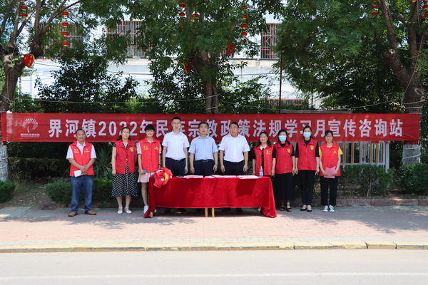 为不断深化民族宗教政策法规知识的宣传普及,推动党的民族宗教政策全面落实,6月16日,界河镇积极组织开展民族宗教政策法规学习月宣传活动。市委统战部副部长、市民族宗教局局长李成波受邀参加活动;镇党委书记王学焱,党委副书记、镇长褚晓飞,镇领导孙晓晴,统战科、妇联、团委等部门参加活动。