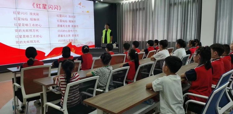 最后,孩子们一起学唱红歌《红星闪闪》,“红星闪闪放光彩,红星灿灿暖胸怀”嘹亮的歌声响彻活动室,与鲜艳的红领巾相得益彰,红色信念也以潜移默化的方式进入孩子们的心怀。