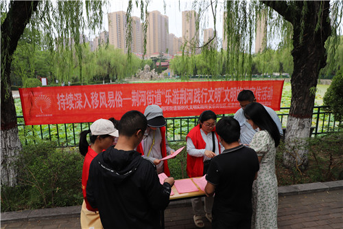 为引导游客自觉践行文明、环保、健康的旅游新风尚,携手营造文明有序的旅游环境,7月28日上午,荆河街道团工委在荆河公园开展“乐游荆河 践行文明”文明旅游宣传活动。2023年暑假青鸟计划大学生和新时代文明实践志愿者及参观游客参加。