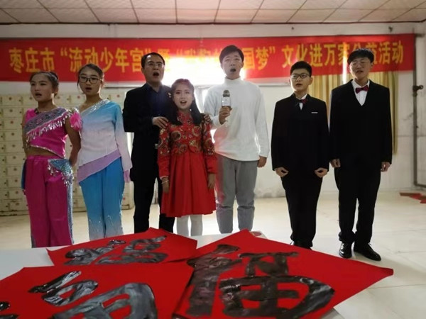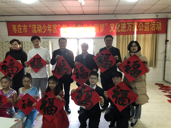 1月14日下午,市青少年宫组织部分党员教师、火炬艺术团小演员和我市知名青年书法家走进峄城区吴林福利院,开展 “流动少年宫”暨“我们的中国梦”文化进万家老少同乐迎新春送温暖公益活动,看望慰问福利院孤寡老人,为福利院写春联送祝福、送文艺节目公益活动。市青少年宫党支部书记、主任种燕,峄城区民政局局长张宏祥,市青少年宫副主任顾连军及吴林街道办事处的同志参加了迎新春送温暖活动。