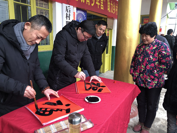参加活动人员在柴胡店镇政府会议室为全镇家庭困难学生举行的“第八届暖冬包裹集中发放活动”,向21名困难家庭少年儿童赠送了精心准备的“暖冬包裹”和爱心大礼包,让孩子们度过一个快乐温暖的春节寒假。随后,领导和市青年书法家协会的书法家们冒雪驱车走进柴胡店镇安后村村委会,为安后村的8名困难家庭小学生赠送了“暖冬包裹”和福袋大礼包。枣庄市振兴乡村服务队驻柴胡店镇工作队成员及安后村党支部书记现场先后发言,向上级部门及领导对乡村振兴工作的支持和困难学子的帮助关心表示感谢。同时,枣庄市青年书法家协会的书法家为居民们现场书写春联赠“福”字。他们挥毫泼墨,楷、篆、行等字体如行云流水,倾情书写,一幅幅飘散着浓浓墨香、寓意吉祥的春联,彰显了中华民族优秀的文化传统和书法艺术的魅力,一个个大红的“福”字,充满了吉祥、喜庆,饱含着温暖、祝福,村民们接福纳祥、拍手称赞,前来要福字春联的群众络绎不绝。“能在家里欣赏到这些国家级书法名家的墨宝,真是开了眼界啦!”一位老人开心的说着笑着,村委会的大院里到处充满着喜悦的笑声,个个脸上洋溢着“如获至宝”的满足和烂漫的笑容,烘托出浓浓的年味。