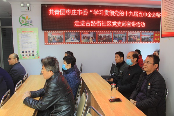 12月4日,共青团枣庄市委在薛城区临山街道举办 “学习贯彻党的十九届五中全会精神”走进古路街社区党支部宣讲活动。团市委四级调研员秦军同志就党的十九届五中全会精神相关内容为社区党员进行了解读,市青少年宫党支部部分党员同志一起参加了学习宣讲活动。