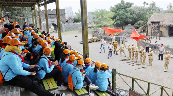 10月16日,首批滕州市东郭、龙阳两镇的58名农村留守儿童和老师来到了闻名遐迩的铁道游击队红色教育基地开展爱国主义教育活动。在铁道游击队影视城,同学们 置身在民国时期的建筑群里,观看实景剧《沙沟受降》、《酒馆锄奸》,同学们仿佛穿越到那个战火纷飞的年代,亲眼目睹了勇敢的铁道游击队员打鬼子、除汉奸,和日寇英勇战斗的感人场景,精彩的战斗场景再现引得同学们阵阵掌声。