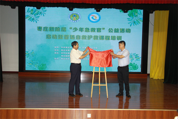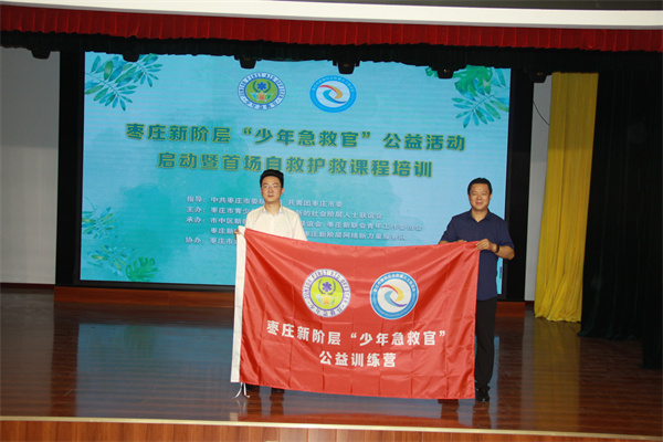新阶层志愿者服务队队长石永尚介绍全国“少年急救官”的发布及报名步骤;市委统战部七科科长王晨、市青少年宫副主任郭向东,共同为“枣庄市青少年安全教育基地”揭牌;市新联会向枣庄新阶层志愿者服务队“枣庄新阶层少年急救官公益训练营”授旗。
