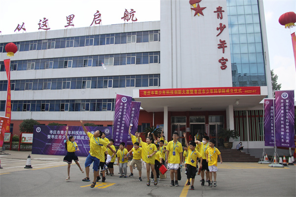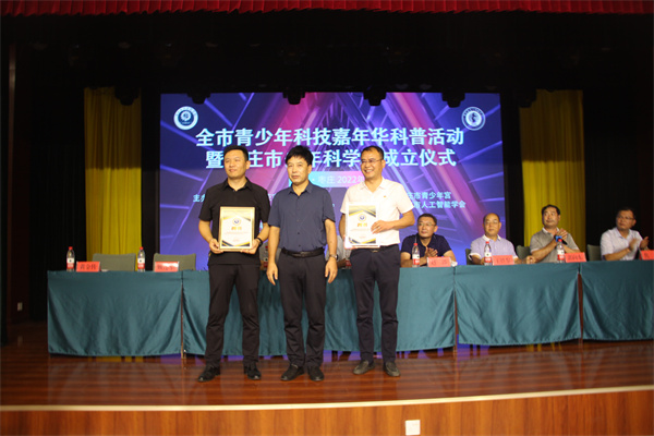 团市委副书记、市少工委主任赵波和市老科技工作者协会副会长、市少年科学院名誉院长王胜黎为枣庄市少年科学院揭牌,出席领导向枣庄市少年科学院各分院授牌。