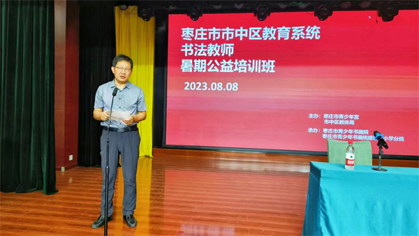 枣庄市教育科学研究院常务副院长、市青少年书画院名誉院长单波参加开班仪式并讲话,市中区教体局党组成员、市中区教学研究中心主任赵兴武,市中区语言文字工作委员会办公室主任、市青少年书画院副院长马睿,市教育科学研究院书法教研员、市青少年书画院院长马德田,市青少年书画院艺术指导宋刚等领导和专家参加开班仪式,开班仪式由市青少年宫副主任郭向东主持。