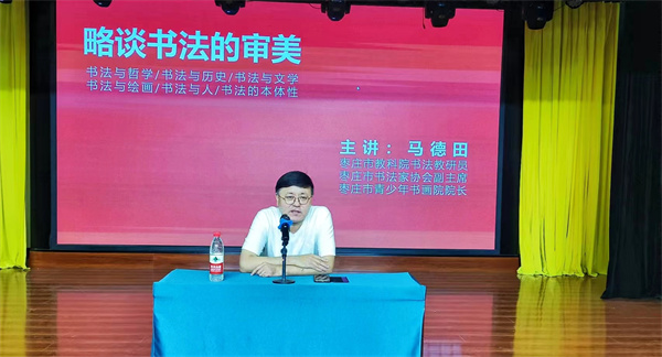 培训期间,市教育科学研究院书法教研员、市青少年书画院院长马德田做了《略谈书法的审美》专题讲座,从书法与哲学、书法与历史、书法与文学、书法与绘画、书法与人、书法的本体性六个方面讲授了书法艺术的文化内涵。市青少年书画院副院长孔璐为大家现场讲授了书法艺术的观察方式、造型训练等技巧,市青少年书画院艺术指导宋刚为大家讲授了粉笔字的书写姿势、执笔的方法及基本笔画和章法布局等知识,并进行了现场示范、书写点评、现场书写指导。