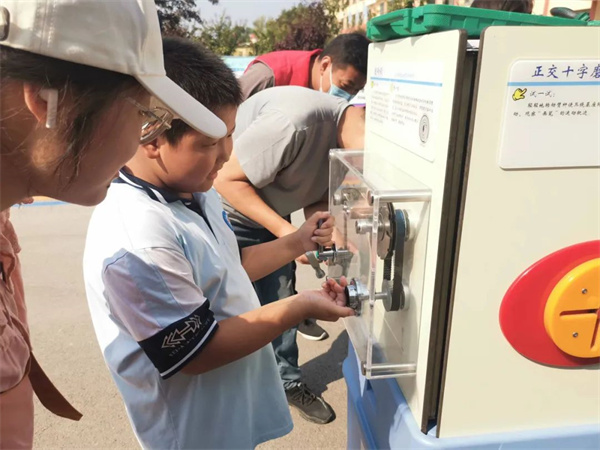 在科普大篷车活动现场,学生们在科普志愿者的引导下,实操体验了“转动生花”“食物金字塔”“混沌摆”等科普器材,亲身体验科学的神奇。