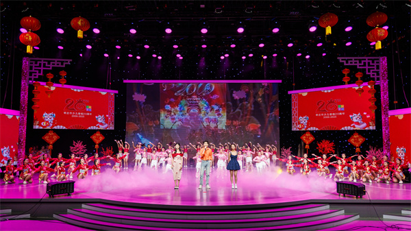 在这个意义非凡的 20周年晚会上,现场气氛热烈得如同燃烧的火焰。晚会舞台布置得美轮美奂,浓郁的春节氛围与鲜明的少儿特色相得益彰。绚丽多彩的灯光,仿若夜空中闪烁的繁星;精致巧妙的道具,恰似点缀艺术殿堂的明珠;五彩斑斓的舞台背景,将整个舞台幻化成一个如梦如幻的艺术仙境。